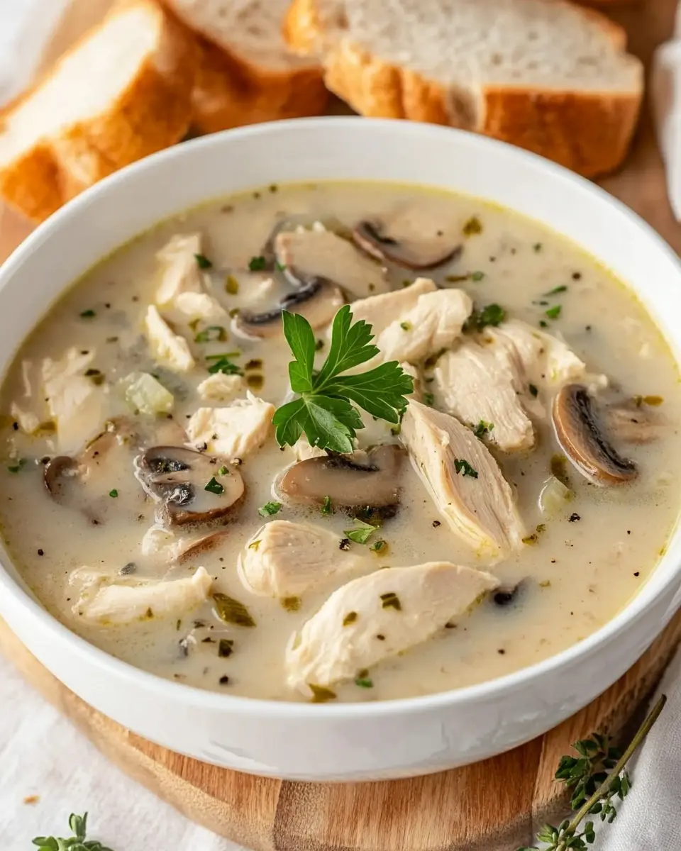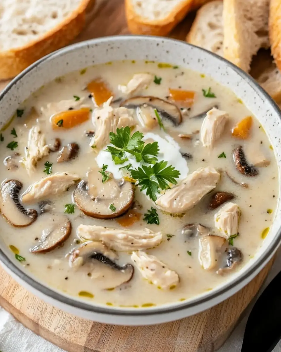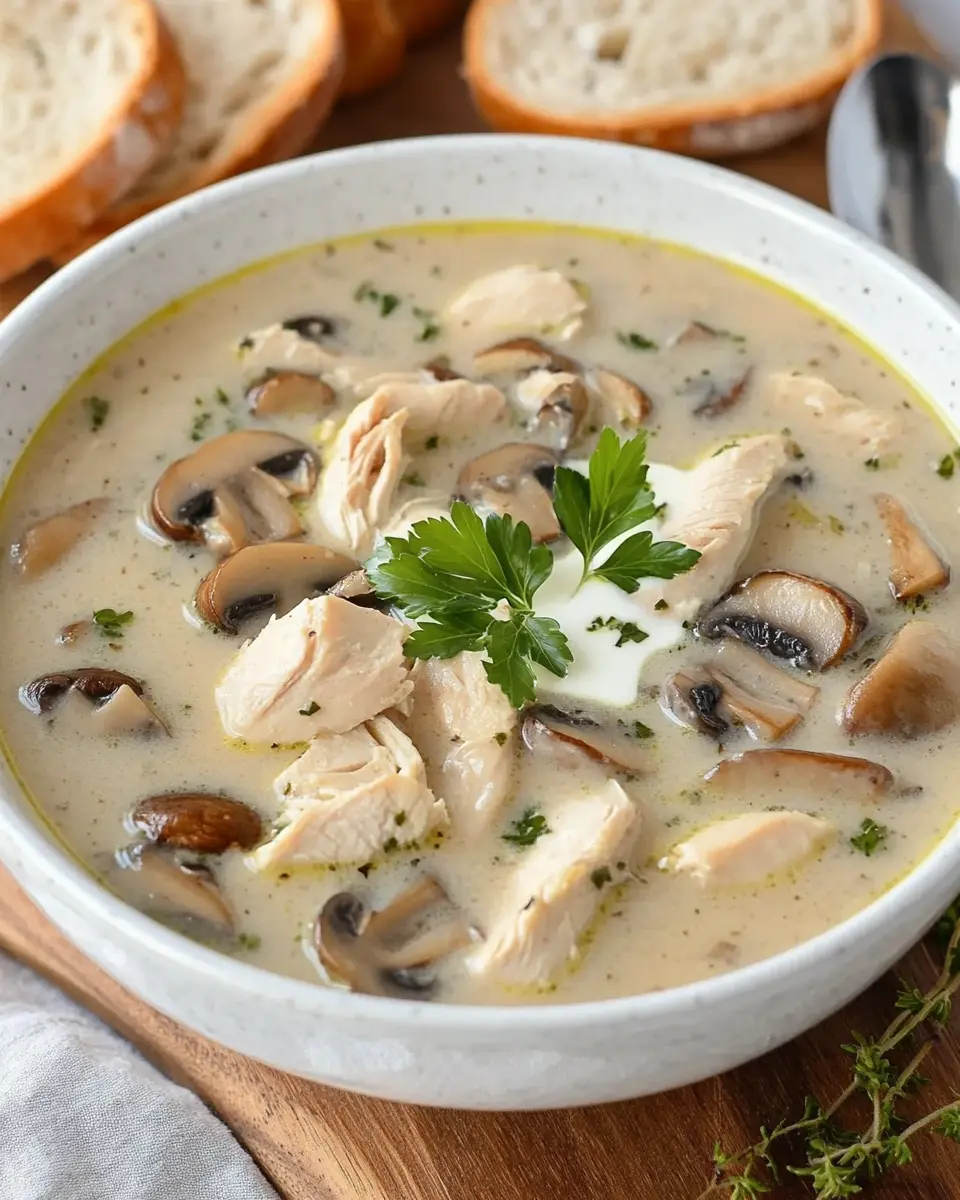Eine köstliche cremige Suppe mit Hühnchen und Pilzen, perfekt für kalte Tage.