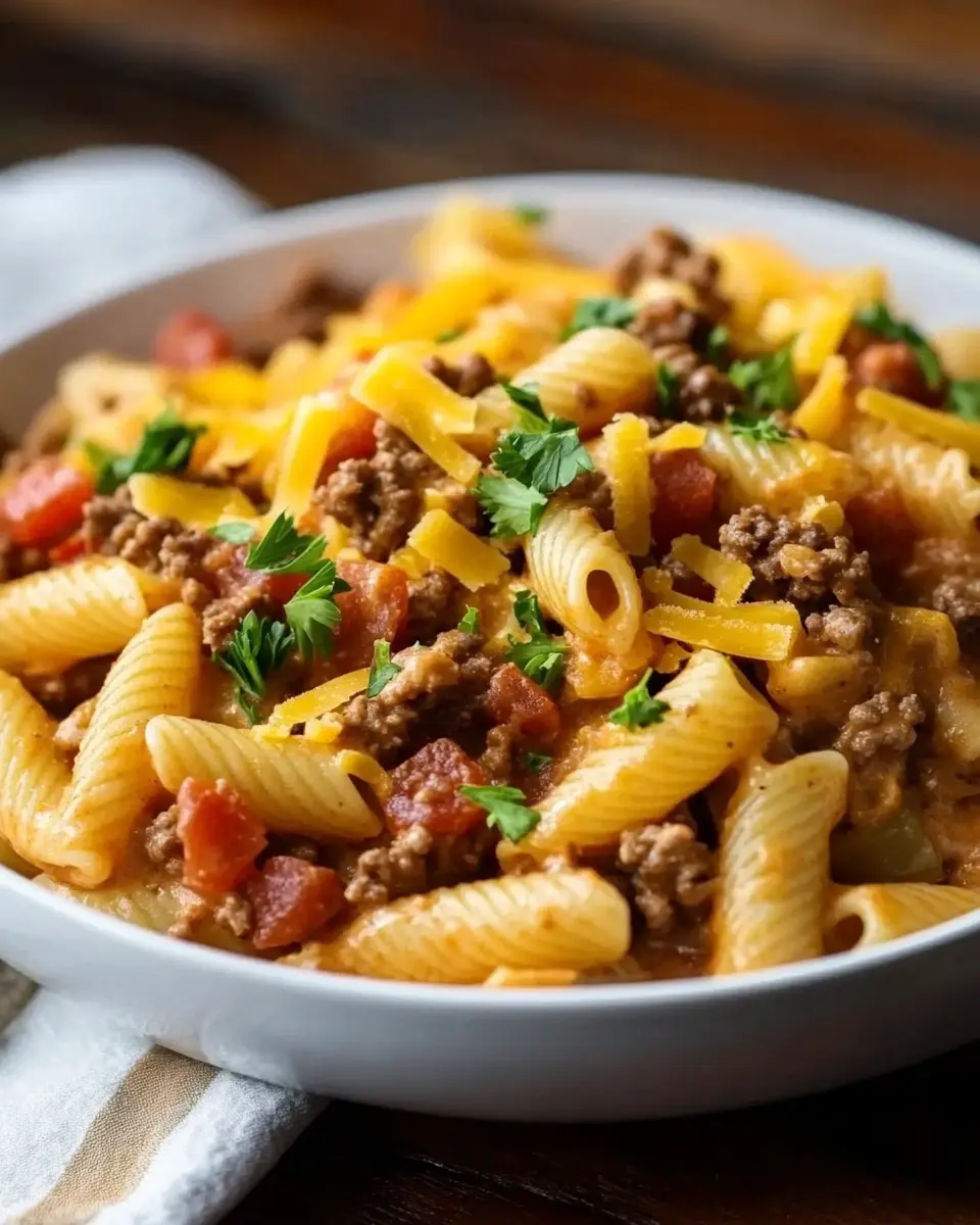 Einfache Cheeseburger-Nudeln (eine Pfanne) vereinen den herzhaften Geschmack eines Cheeseburgers mit der Bequemlichkeit von Nudeln. Dieses Gericht ist nicht nur schmackhaft, sondern auch extrem einfach zuzubereiten, was es für vielbeschäftigte Menschen attraktiv macht. Mit nur wenigen Zutaten und einer einzigen Pfanne werden Sie in kürzester Zeit ein köstliches Essen zaubern, das die ganze Familie begeistert.